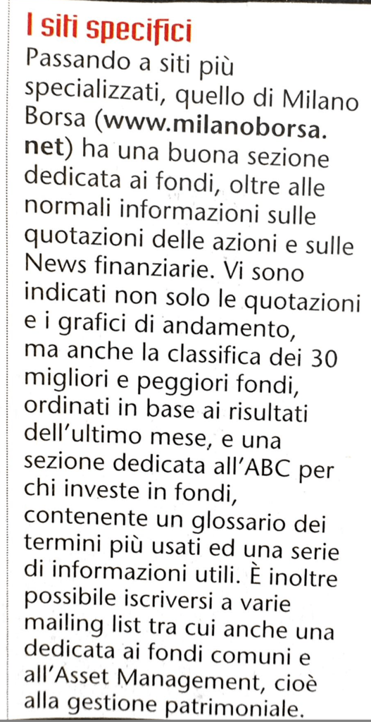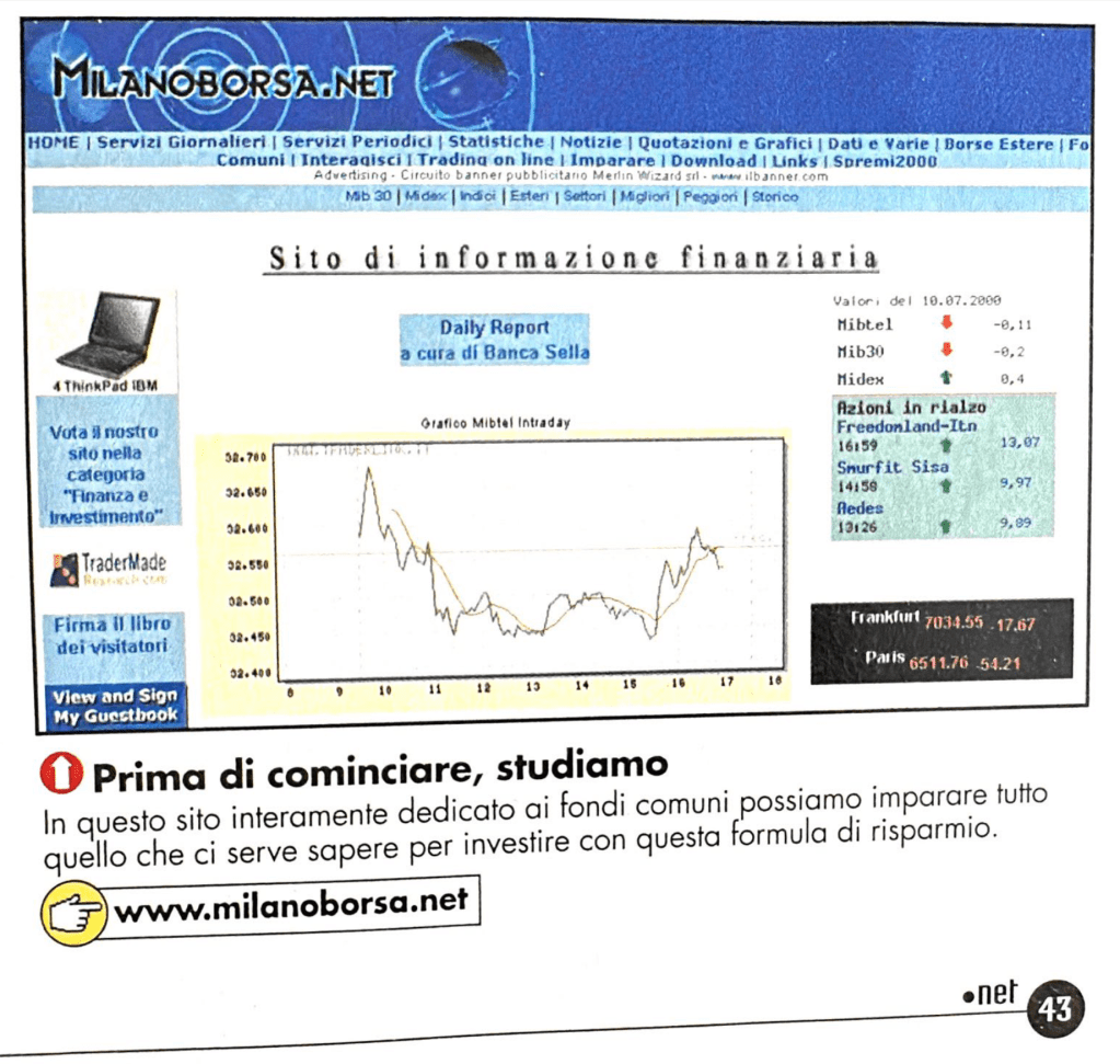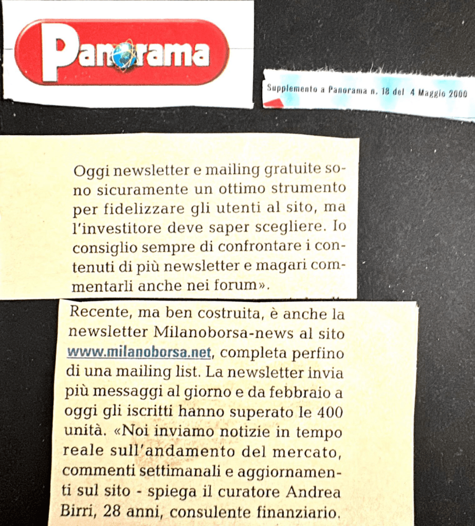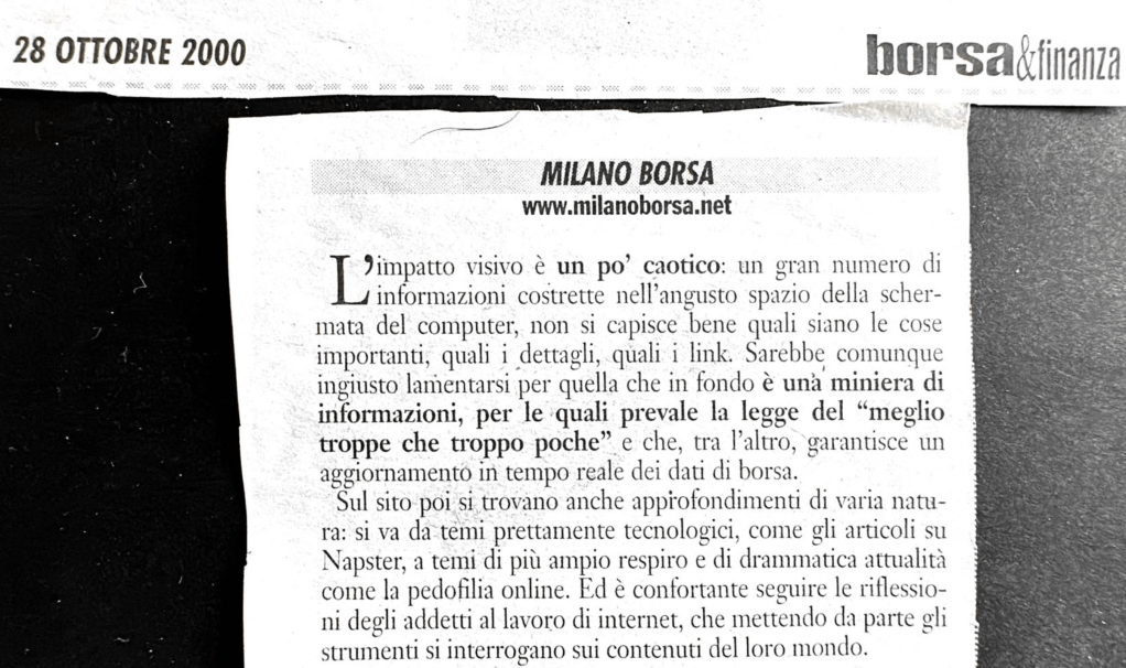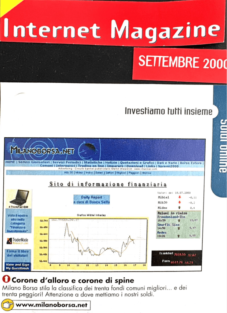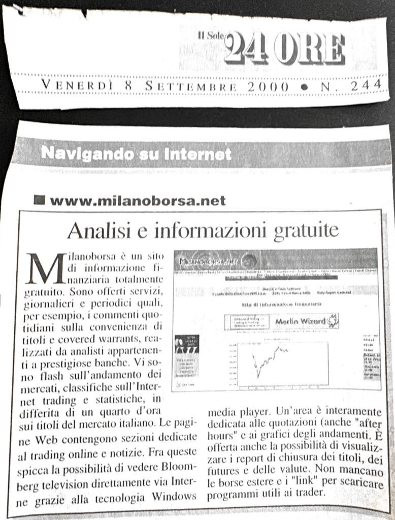 Throughout the years, in addition to various projects, I managed the website http://www.milaborsa.net during the early days of mass Internet adoption, which later evolved into http://www.servizidiborsa.it, a site I eventually sold to a company that, after a few years, stopped maintaining it as it would have required. During that period, I briefly collaborated with the two founders of trend-online.com, a project I chose not to join. Instead, I decided to continue as a private trader, focusing on other activities that were already demanding a lot of my time. I have never regretted this decision.
